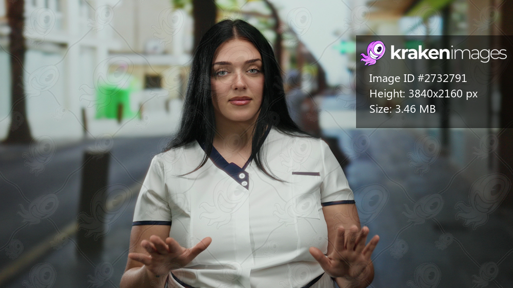 Woman standing on city street with eyes closed wearing white shirt, showcasing calmness in urban setting.
