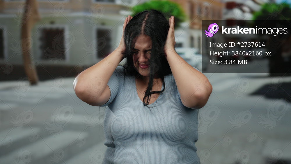 Woman standing on city street with hands on head, looking distressed in an outdoor urban setting, wearing casual blue shirt, suggesting stress or sadness while surrounded by cityscape. - Kraken Images