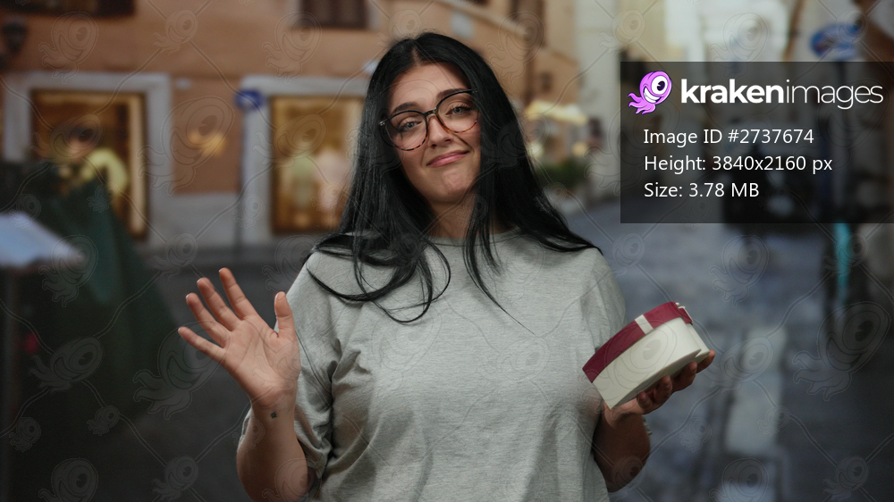 Woman standing on city street holding container and waving, exemplifying confident urban life.