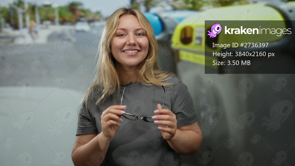 Woman standing on city street holding sunglasses smiling near recycling bins with long blonde hair wearing casual clothes outdoors showing joyful expression - Kraken Images