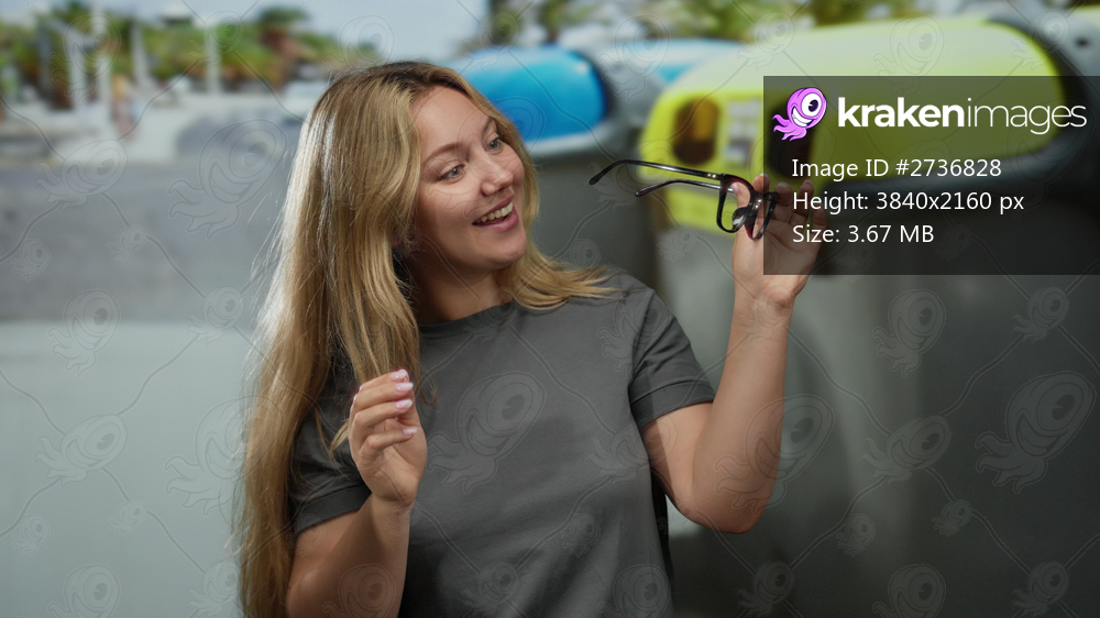 Woman standing on city street holding sunglasses smiling near recycling bins with long blonde hair wearing casual clothes outdoors showing joyful expression - Kraken Images