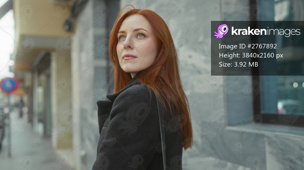 Woman standing on city street with red hair and black coat, gazing thoughtfully amid urban surroundings, reflecting a serene and confident demeanor.