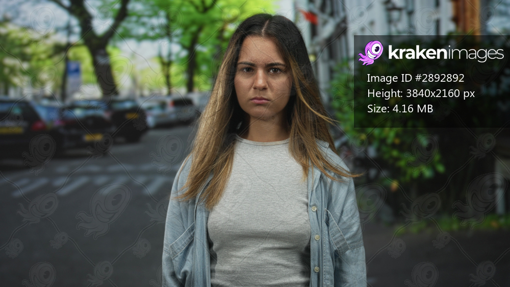 Woman standing on city street with serious face and windblown hair, frontal pose near parked cars and sidewalk; anger defiance.