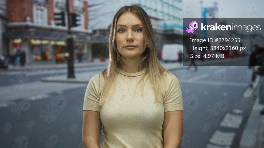 Woman standing on city street wearing casual outfit surrounded by urban buildings traffic and people reflecting lively atmosphere in outdoor environment. - Kraken Images