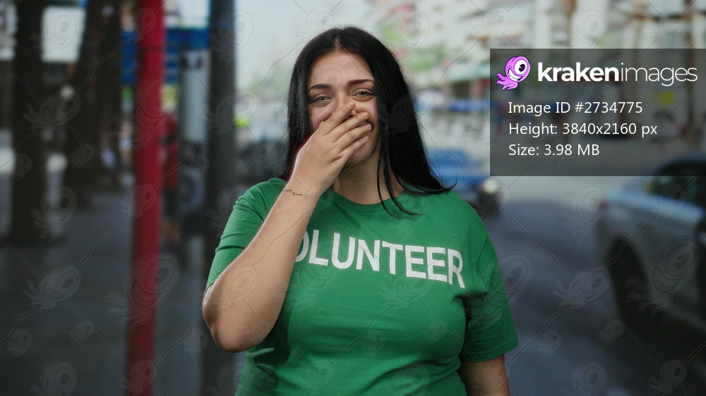 Woman standing on city street wearing volunteer shirt smiling confidently at camera urban outdoor setting usa cars background curvy casual fashion plus size female youth energetic. - Kraken Images