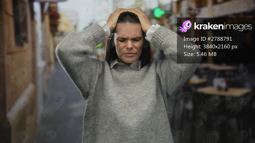 Woman standing on city terrace with eyes closed and hands on head, feeling stressed, wearing grey sweater in outdoor coffee scene, evokes urban life and emotion. - Kraken Images