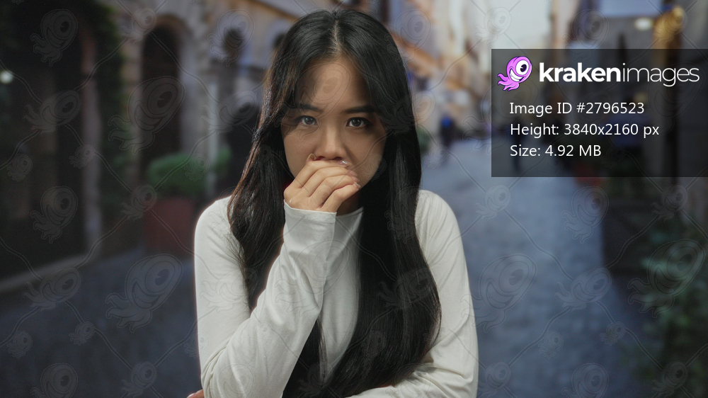 Woman standing on cobblestone street with thoughtful expression in outdoor urban setting, surrounded by historic architecture and blurred background of people walking. - Kraken Images