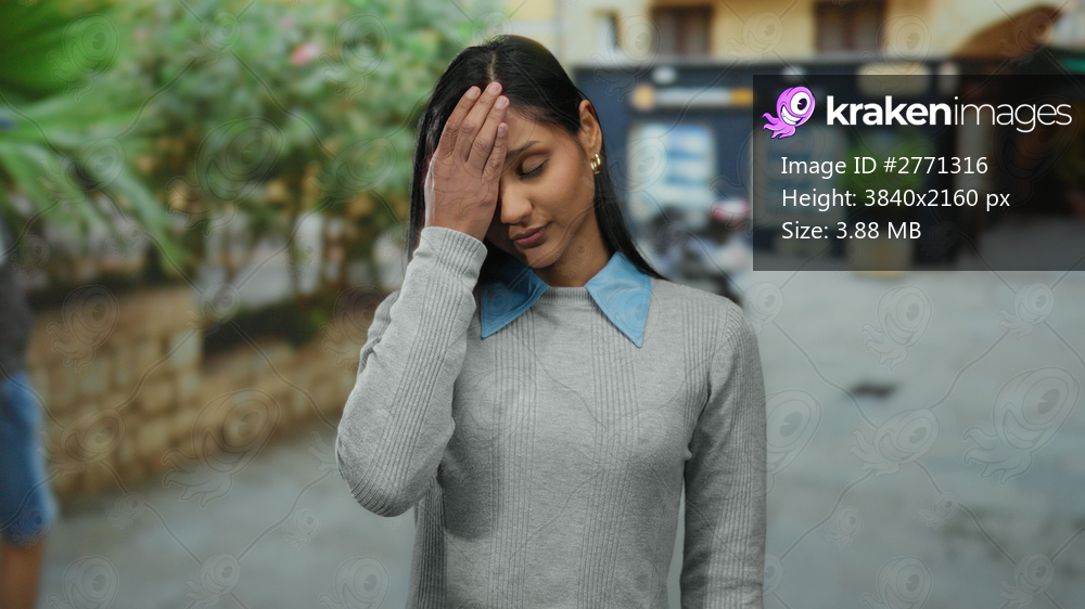 Woman standing on outdoor street with plants in blurred background, wearing grey sweater with blue collar, appearing thoughtful and expressive with open palm gesture. - Kraken Images