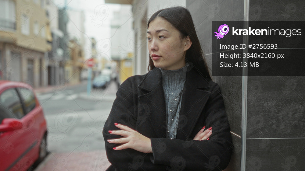 Woman standing on urban street with arms crossed, showcasing confidence and style in city environment.