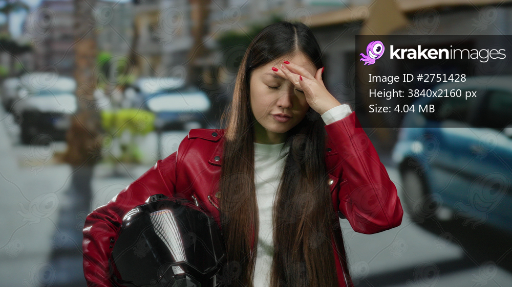 Woman standing on urban street in red jacket holding black helmet with a thoughtful expression surrounded by blurred cityscape and parked cars suggesting modern lifestyle. - Kraken Images