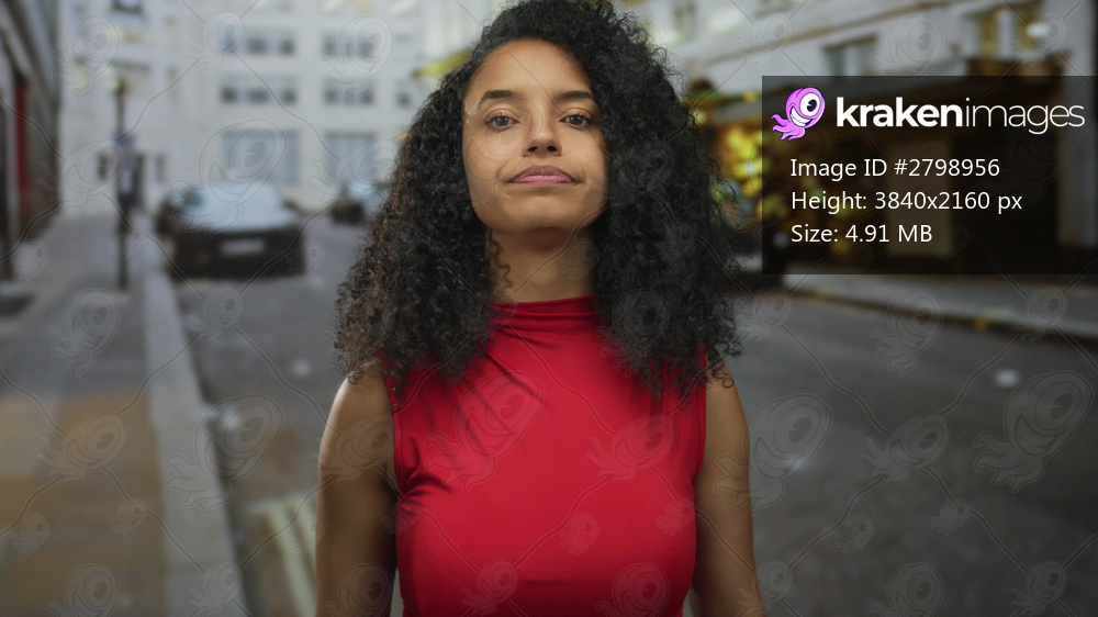 Woman standing on urban street wearing red top, displaying puzzled expression, with curly hair in outdoor setting, suggesting a casual and relatable moment. - Kraken Images