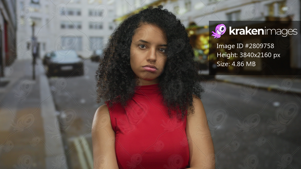 Woman standing on urban street wearing red top, displaying puzzled expression, with curly hair in outdoor setting, suggesting a casual and relatable moment. - Kraken Images