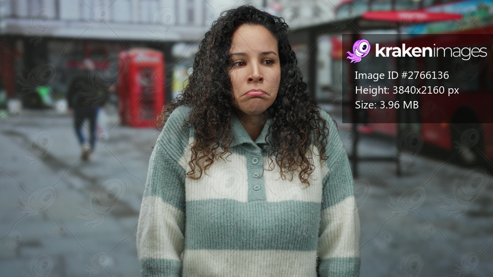 Woman standing outdoors with a sad expression near a red telephone booth and double-decker bus in a busy street capturing urban london scene showing emotion and lifestyle. - Kraken Images