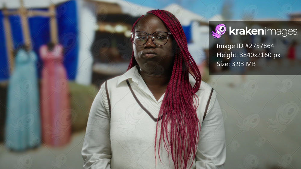 Woman standing outdoors with braids and glasses at a city market near colorful clothing stalls looking displeased during the day.
