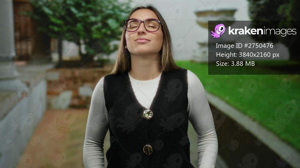 Woman standing outdoors with closed eyes in peaceful urban garden setting wearing glasses and casual vest on a sunny day
