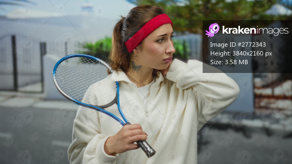 Woman standing outdoors holding racket looking thoughtful wearing casual urban sportswear with tree background capturing city street ambiance and youthful vitality. - Kraken Images