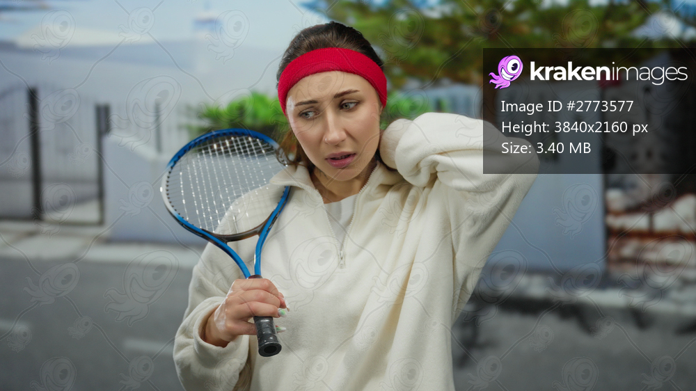 Woman standing outdoors holding racket looking thoughtful wearing casual urban sportswear with tree background capturing city street ambiance and youthful vitality. - Kraken Images