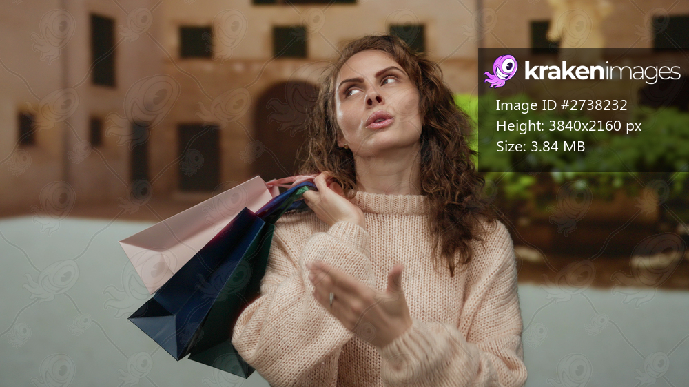 Woman standing outdoors holding shopping bags on a city street with an expression of exhaustion after shopping