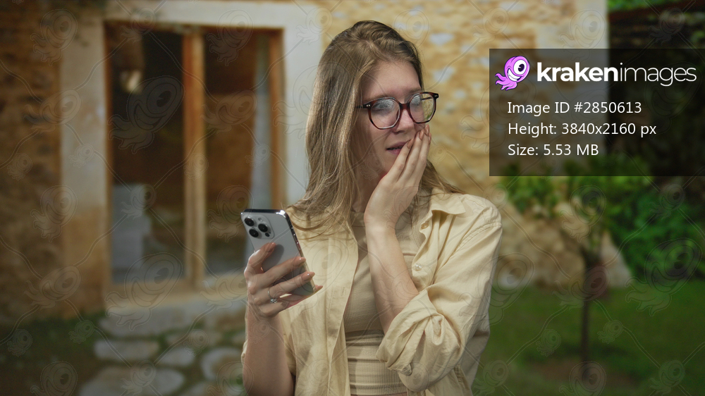 Woman standing outdoors holding smartphone with finger to lips for silence at a stone building facade; surprise.