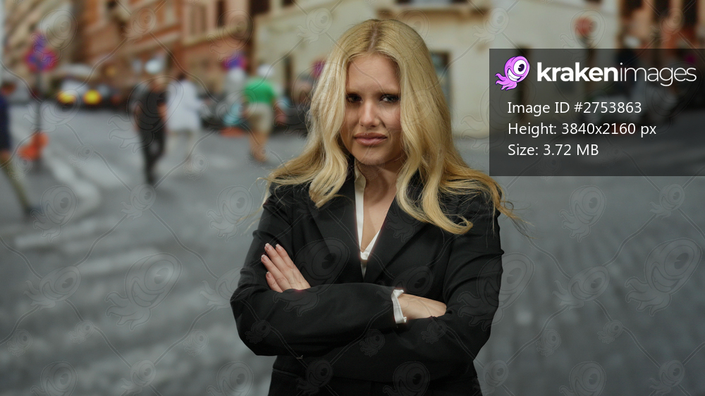 Woman standing outdoors in a bustling city street, appearing worried and contemplative, embodying urban emotion and stress in a crowded environment.