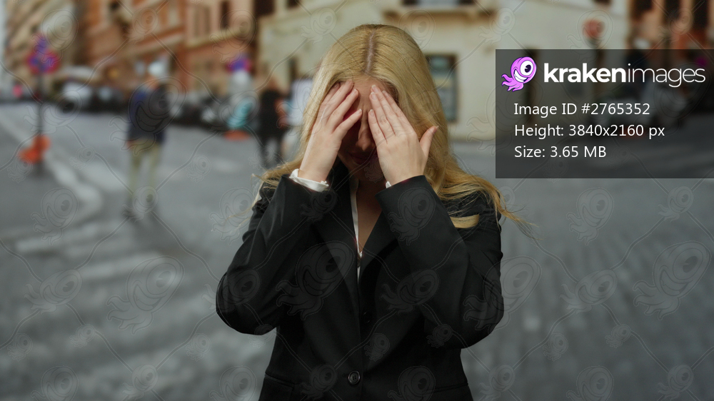 Woman standing outdoors in a bustling city street, appearing worried and contemplative, embodying urban emotion and stress in a crowded environment.