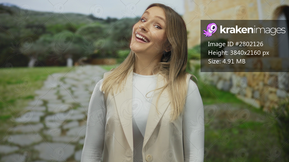 Woman standing outdoors in a park with a stone path and greenery, showcasing neutral expressions amid rustic scenery, emphasizing simplicity and natural surroundings. - Kraken Images