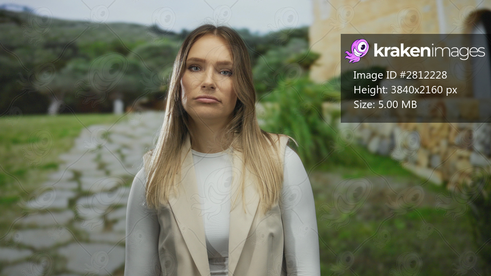 Woman standing outdoors in a park with a stone path and greenery, showcasing neutral expressions amid rustic scenery, emphasizing simplicity and natural surroundings. - Kraken Images