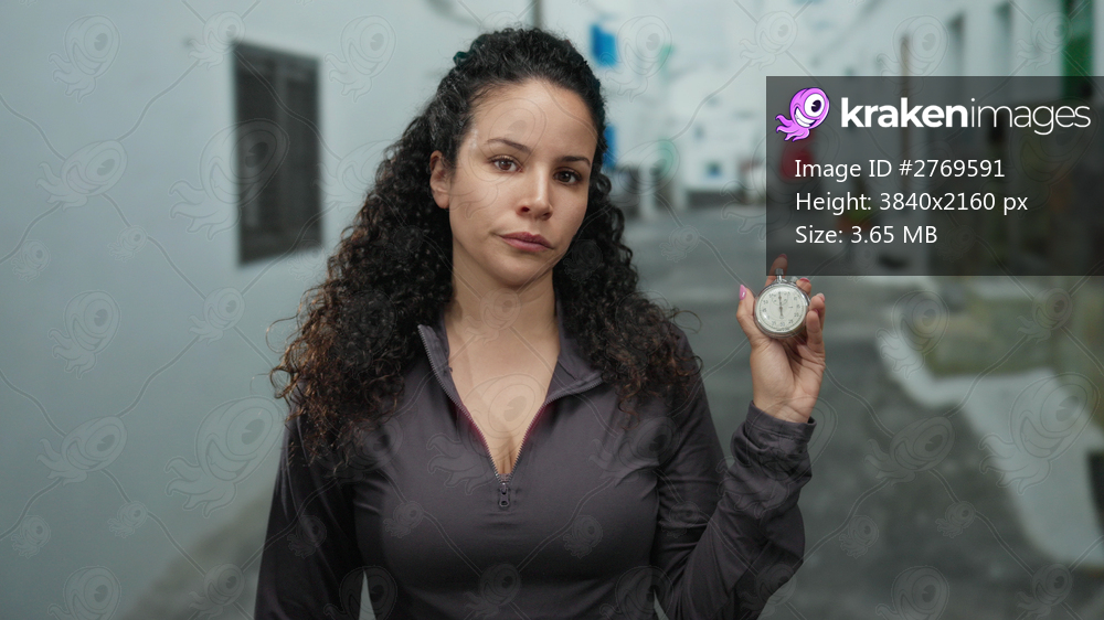 Woman standing outdoors in a street holding a stopwatch, curly hair and athletic jacket create a focused expression in a bright urban setting suggesting precision and time awareness. - Kraken Images