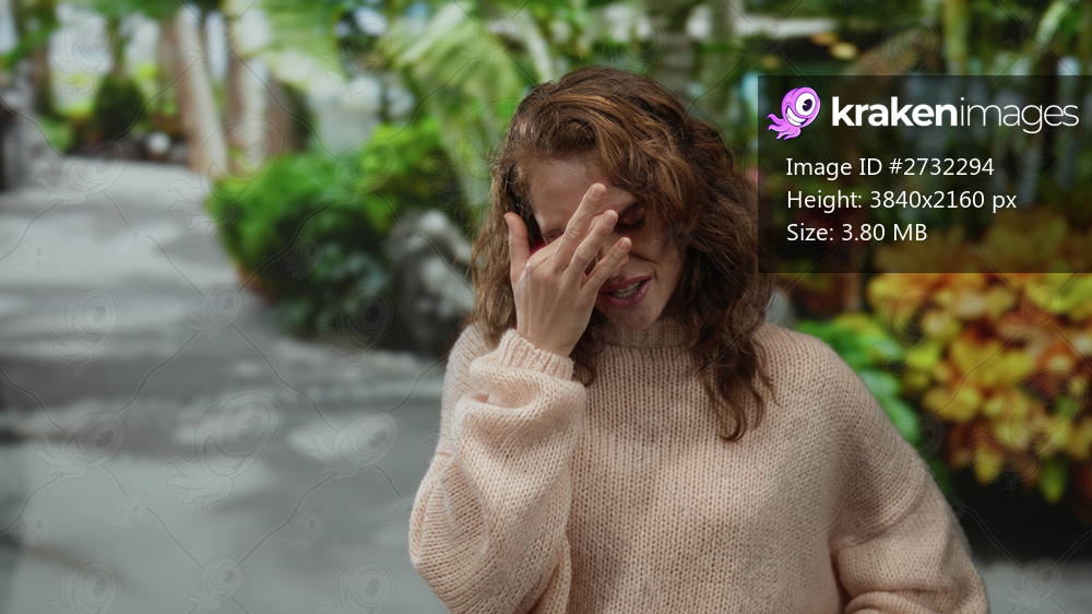 Woman standing outdoors in city street, covering her face with hand, surrounded by lush greenery, wearing casual sweater, expressing emotion in warm urban setting. - Kraken Images