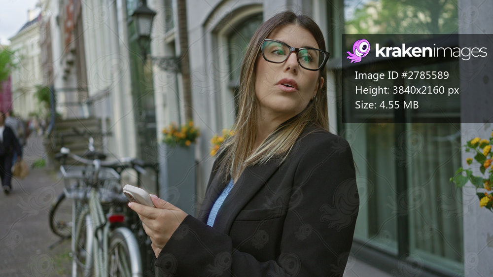 Woman standing outdoors in european city street holding smartphone looking thoughtful brunette wearing glasses surrounded by architecture bicycles and vibrant flowers - Kraken Images