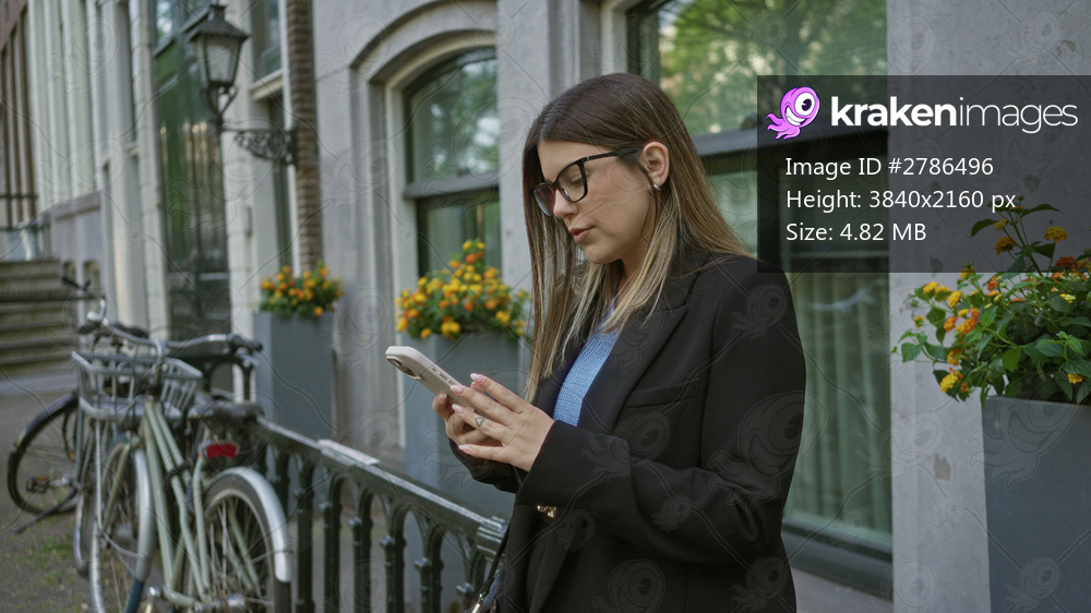 Woman standing outdoors in european city street holding smartphone looking thoughtful brunette wearing glasses surrounded by architecture bicycles and vibrant flowers - Kraken Images