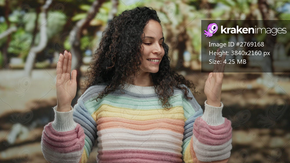 Woman standing outdoors in park wearing colorful sweater smiling with eyes closed making hand gesture surrounded by trees and nature in sunny setting.