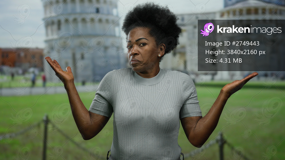 Woman standing outdoors near pisa tower with a thoughtful expression, wearing a grey shirt, in an urban italian setting, showcasing cultural travel and architecture. - Kraken Images