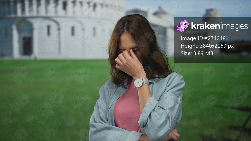 Woman standing outdoors near pisa tower, looking thoughtful with arms crossed, wearing casual attire, against the iconic italian landmark in a sunny setting. - Kraken Images