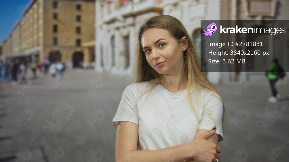 Woman standing outdoors on a busy city street in casual attire with an expression of confidence and curiosity surrounded by urban life and architecture capturing everyday moments. - Kraken Images