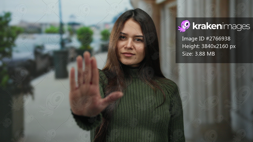 Woman standing outdoors on a city street gesturing stop with hand extended, wearing a green sweater, exuding a sense of calm and confidence amid urban surroundings. - Kraken Images