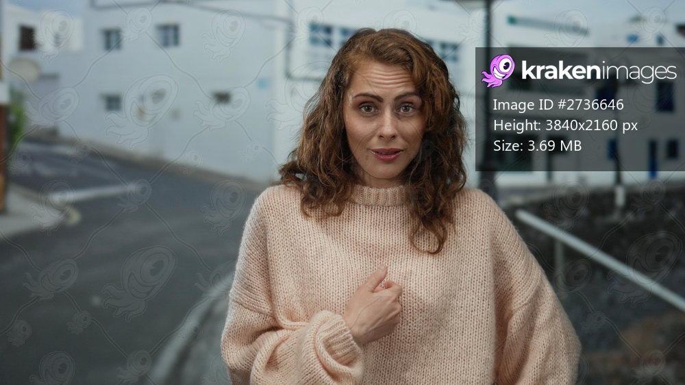 Woman standing outdoors on a city street wearing a sweater with a thoughtful expression and urban backdrop, portraying casual fashion and lifestyle.