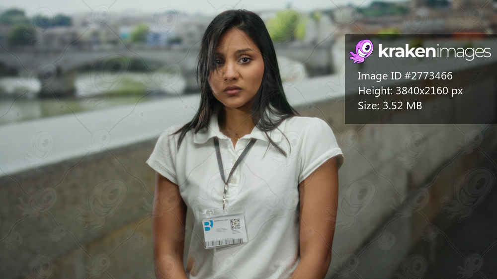 Woman standing outdoors on a street with a name badge, appears pensive, wearing a white shirt with a cityscape in the background.