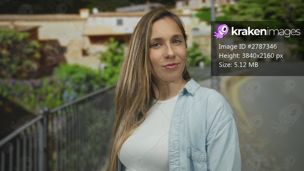 Woman standing outdoors on a sunny day with long blonde hair, wearing a casual shirt, surrounded by greenery and rustic architecture in the background, looking relaxed and content. - Kraken Images