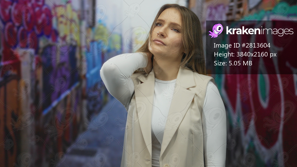 Woman standing outdoors on city street with colorful graffiti holding neck in discomfort, wearing beige jacket, suggesting urban lifestyle.