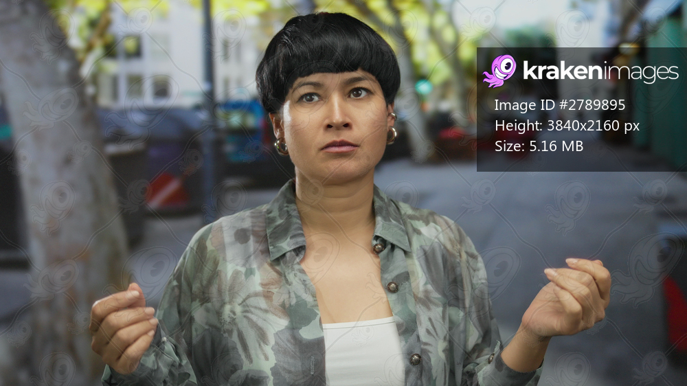 Woman standing outdoors on city street with trees, wearing patterned blouse, gesturing thoughtfully, urban setting, daytime, focused expression, earrings visible.
