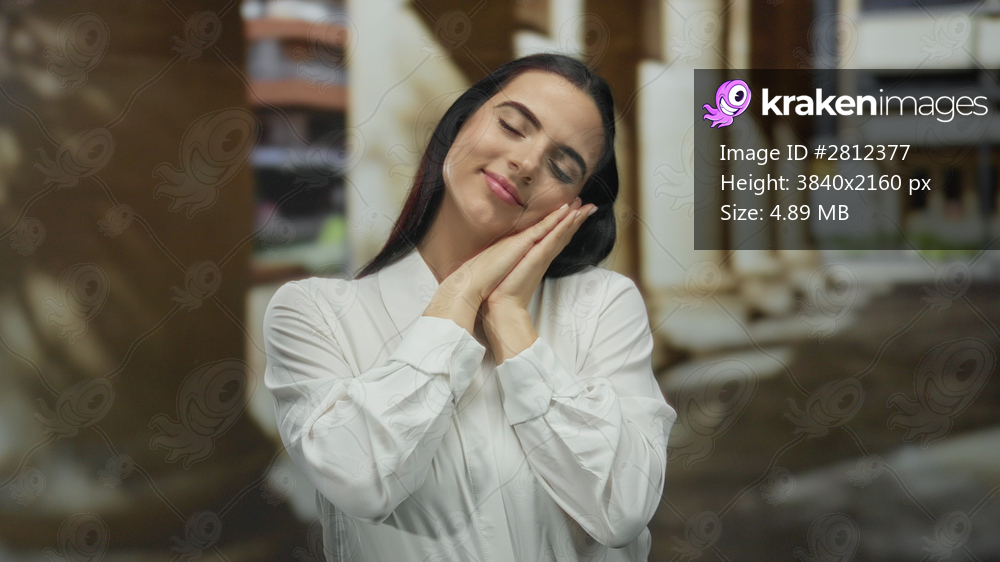 Woman standing outdoors on street with eyes closed making sleep gesture wearing white shirt in sunny urban environment surrounded by columns