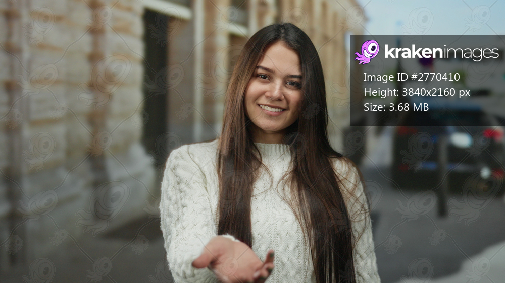Woman standing outdoors on street smiling in casual white sweater with long hair, offering hand forward in a friendly gesture, with blurred urban background, conveying warmth and approachability. - Kraken Images