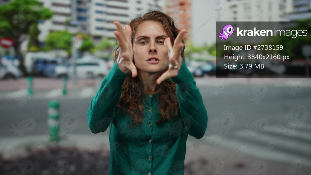 Woman standing outdoors on urban city street with buildings in background looking up wearing green sweater appearing thoughtful and contemplative during daytime. - Kraken Images