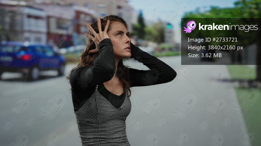 Woman standing outdoors on urban street covering ears appearing stressed, wearing a black top and checkered dress with a blurred cityscape in the background. - Kraken Images