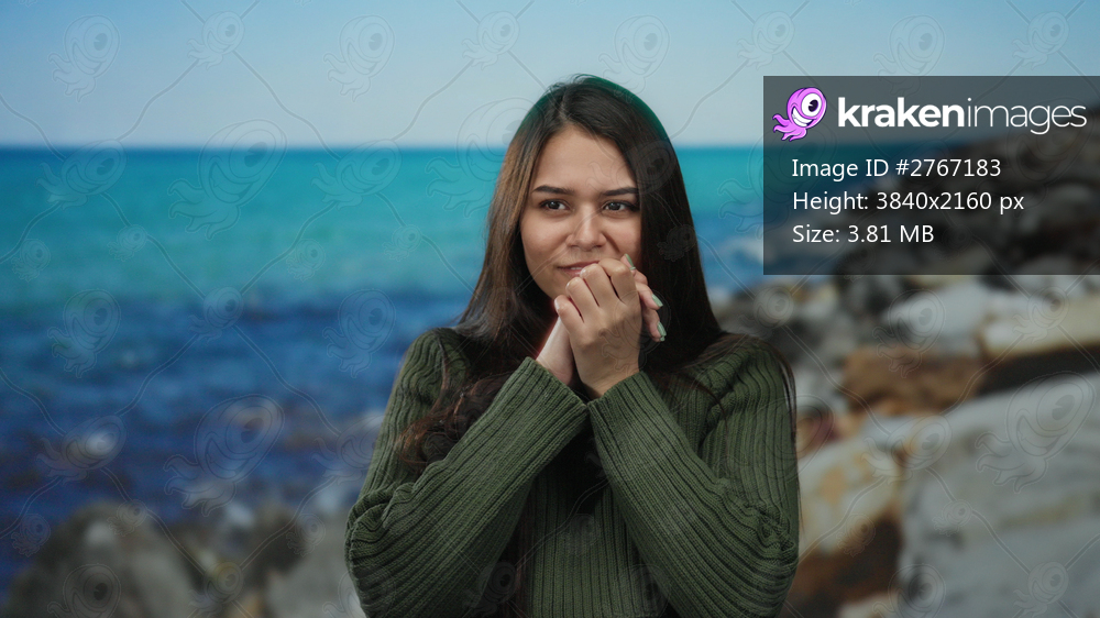 Woman standing quietly by the seaside with a pensive expression, the serene ocean backdrop capturing her deep thoughts in this outdoor beach setting.