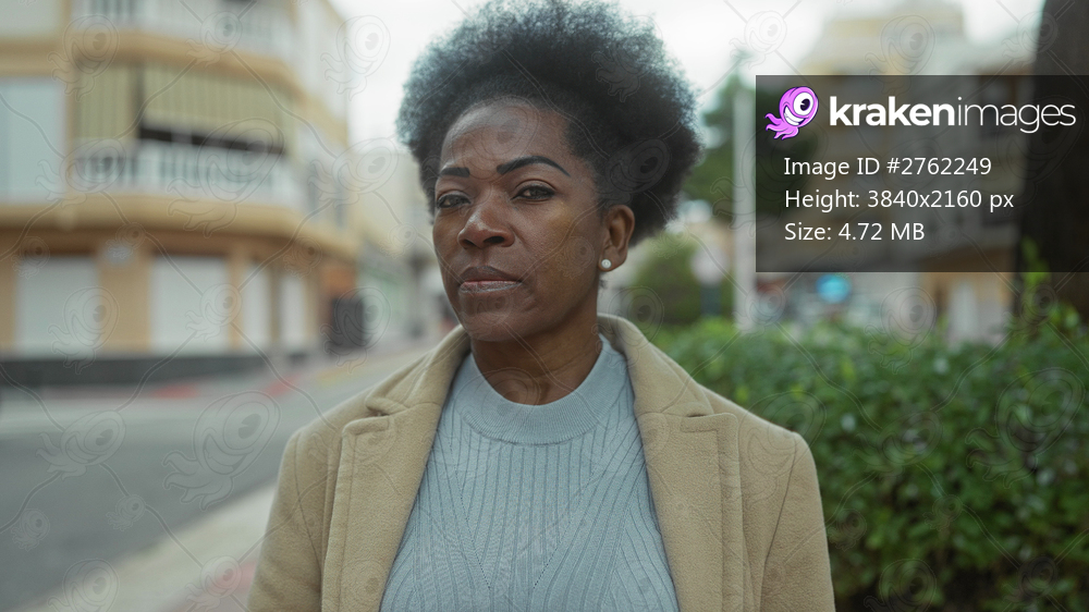 Woman standing serious in city street wearing coat outdoors showing urban lifestyle during daytime with calm demeanor and contemporary background buildings - Kraken Images
