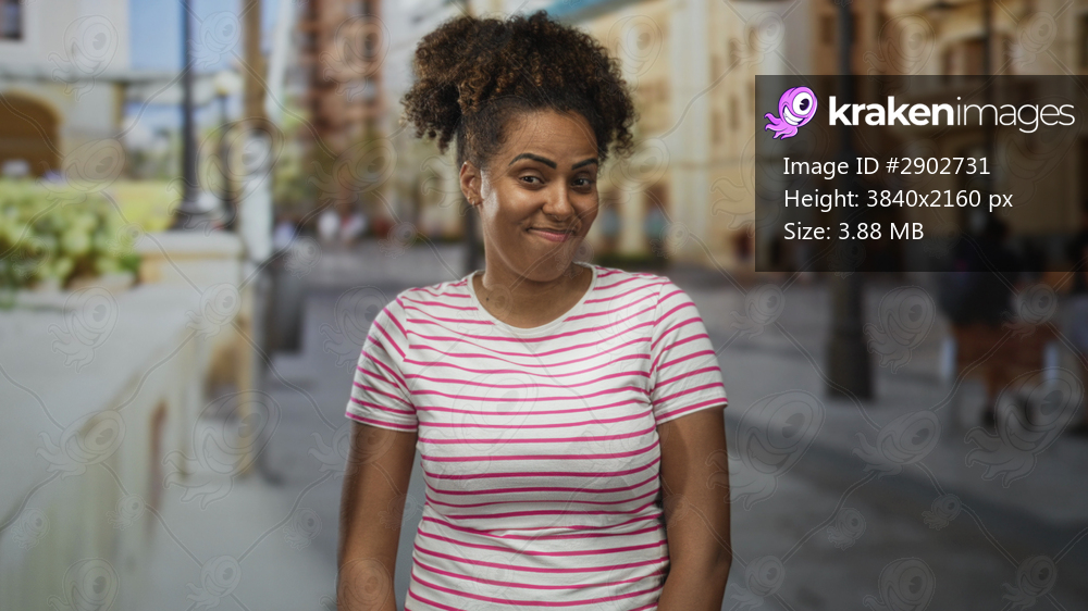 Woman standing and smiling in pink striped t shirt on city street with curly hair and relaxed posture; playful confidence.