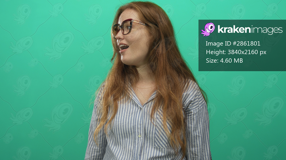 Woman standing smiling with open mouth wearing glasses and a striped shirt in bright green studio; joy.