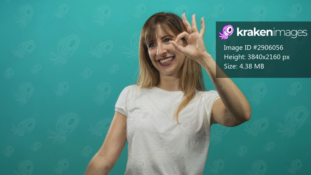 Woman standing and smiling while showing ok sign with right hand in studio teal backdrop; approval joy.